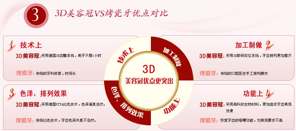 烤瓷牙虽然有诸多的优点,但是镶烤瓷牙是一个漫长的过程,对于上班族和学习比较紧张的学生来说没有很多的时间去镶牙,如果您想快速镶牙,而且美观度和相容性更好的话建议您选择3D美容冠。